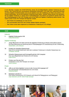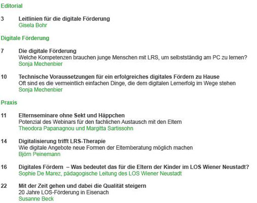 Diese Ausgabe beschäftigt sich mit dem sehr aktuellen Titelthema, „Digitale Förderung bei LRS“. Durch den Lockdown während der Corona-Pandemie ist das digitale Lernen zu Hause zur unabdingbaren Notwendigkeit geworden. Auch die Lehrer und Schüler, die sich lange dagegen gewehrt haben, müssen sich nun in die „neue Welt“ einarbeiten und sich in ihr zurechtfinden. Dies ist Herausforderung und Chance zugleich.